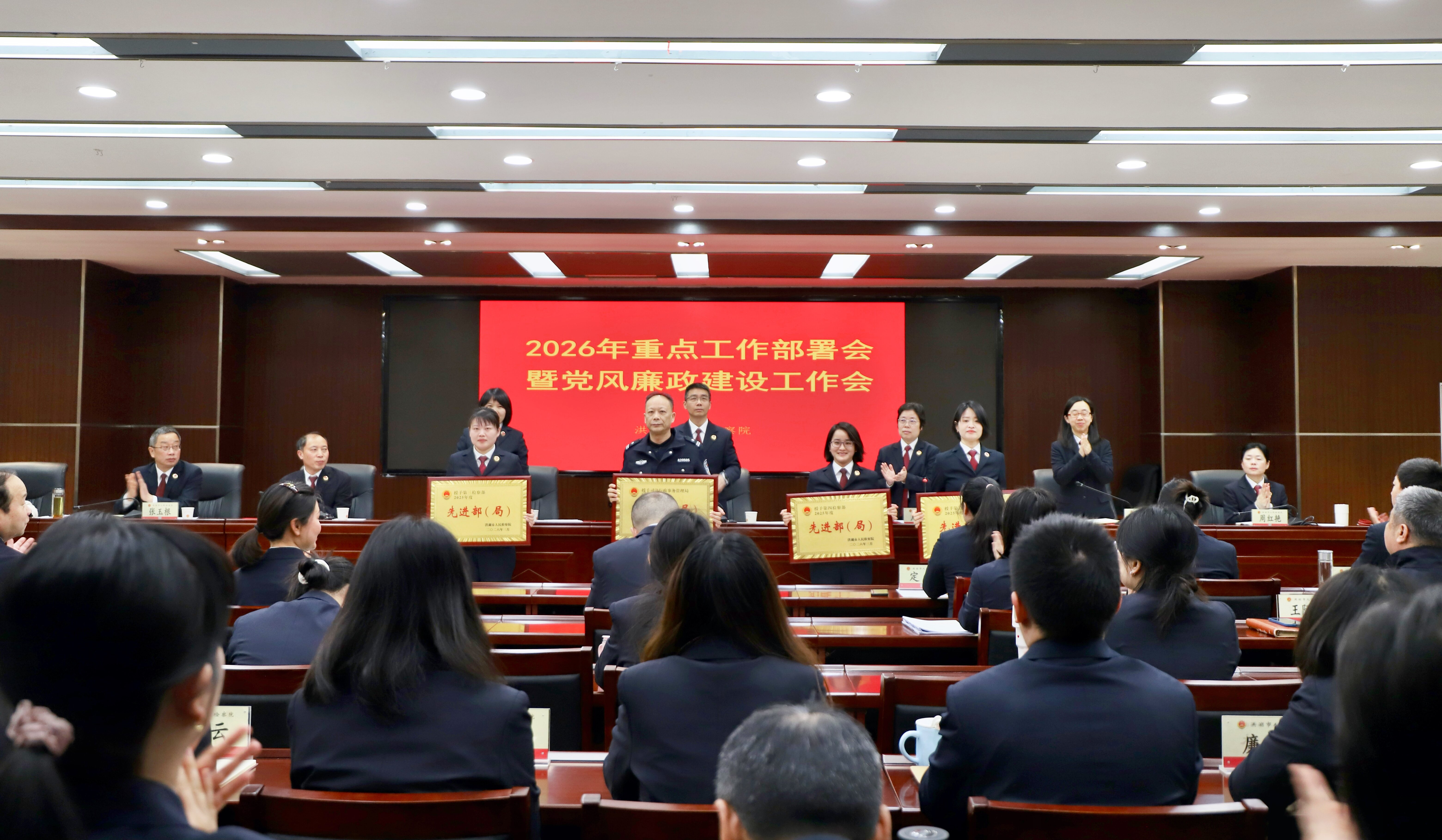 会议传达了全市检察机关党风廉政建设工作会议精神,宣读了2025年度洪湖市人民检察院集体和个人获得上级表彰和荣誉情况的通报以及表彰2025年度先进部(局)、年度“洪检之星”、“先进工作者”的决定。
