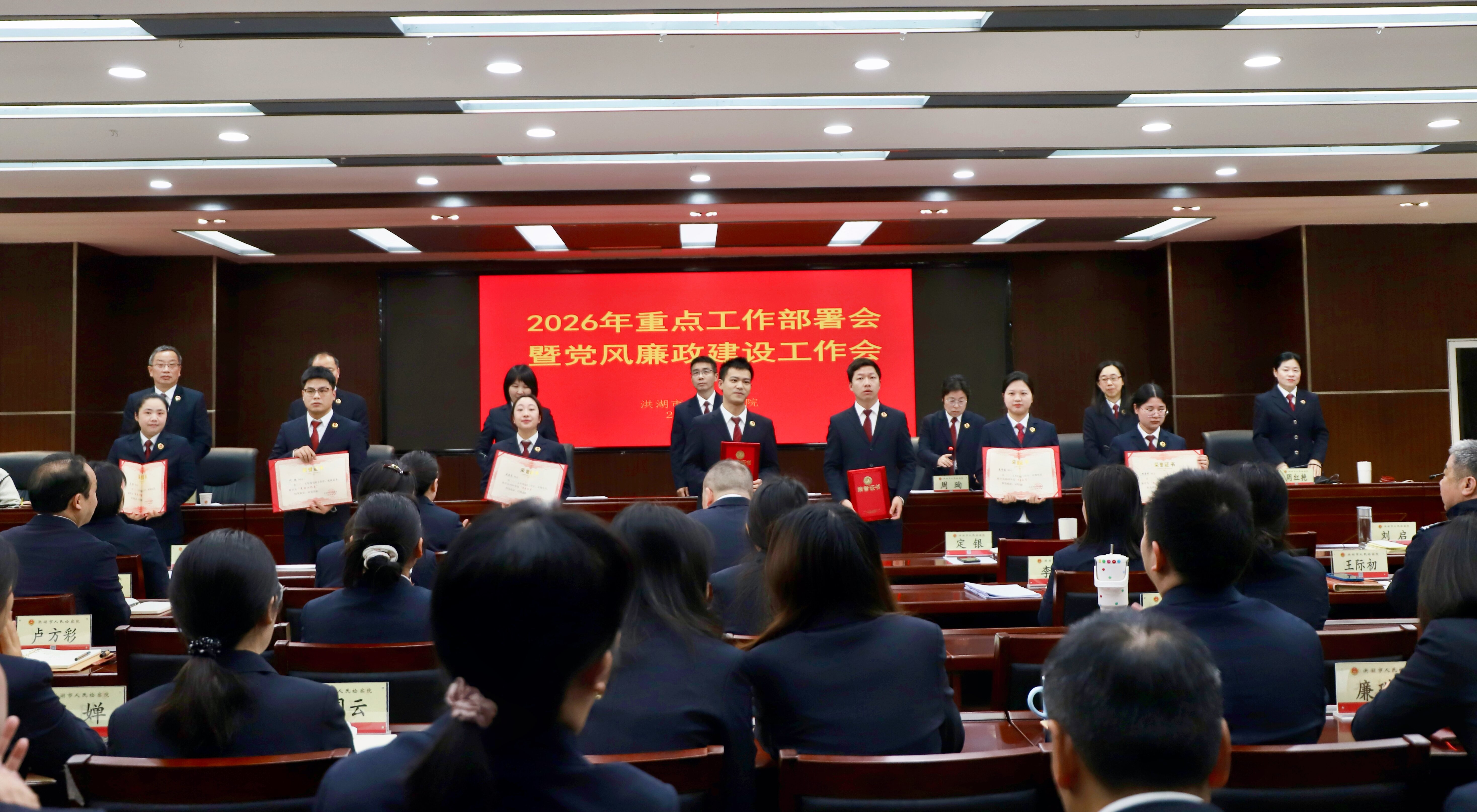 会议传达了全市检察机关党风廉政建设工作会议精神,宣读了2025年度洪湖市人民检察院集体和个人获得上级表彰和荣誉情况的通报以及表彰2025年度先进部(局)、年度“洪检之星”、“先进工作者”的决定。